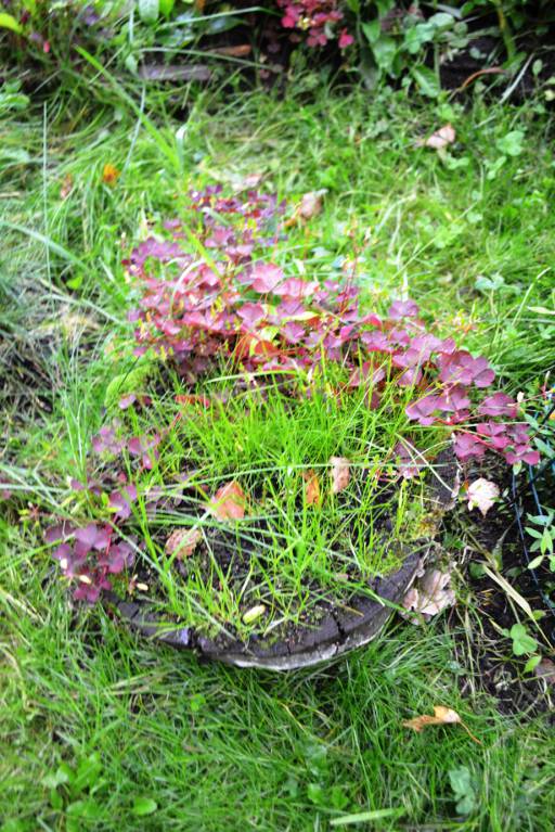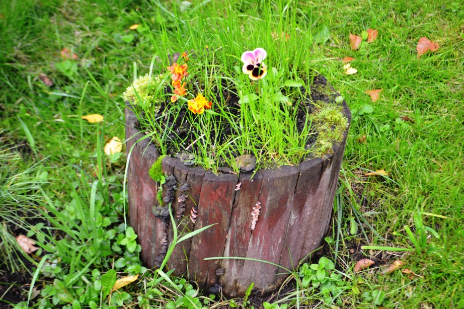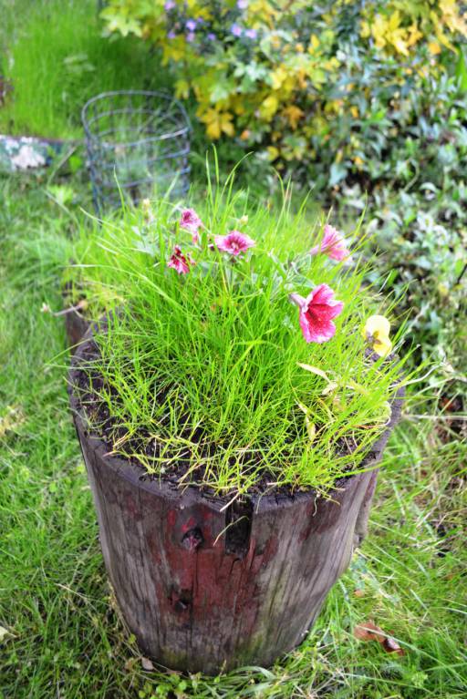 , и горох и бобы. Хорошо газон уродился. Семена травы попали сами в один пенек-клумбу (1 фото), в остальные пеньки я сыпанула газона, так как цветы поели соседские козы, приехала с Алтая, ахнула, отлично газон в пеньках уродился.