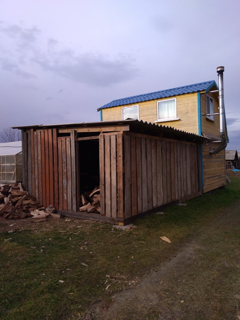 Построил "новый" дровеник, хотя новые там только стропила. Всё остальное - сильно б/у материал, который на дрова пустить жалко, а в капитальных строениях использовать нельзя. Крыша тоже из древнего шифера, оставшегося от крыши отремонтированного сарая.