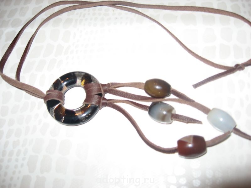 Колье. Колечко- это подвеска как бы из муранского стекла, показалось маловасто, поменяла силиконовую веревочку на кожаную и добавила бусины от старого колье.