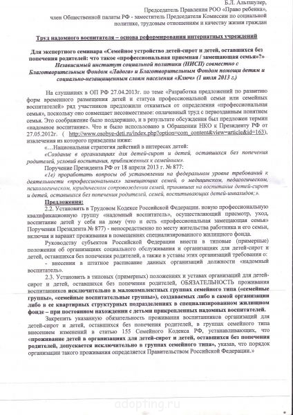 На слушаниях в ОП РФ 27.04.2013г. по теме "Разработка предложений по развитию форм временного размещения детей и